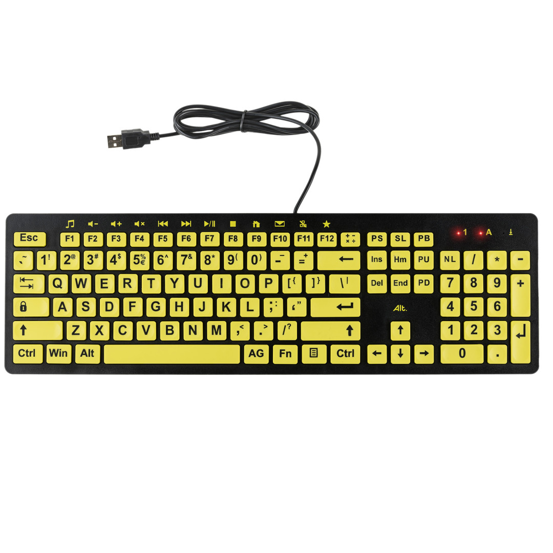 The ClearKeys keyboard is designed for people with a form of visual impairment. Its high contrasting yellow and black colors and use of bold font help guide people with low vision to use the keyboard effectively. This keyboard has a US-international, ANSI layout.