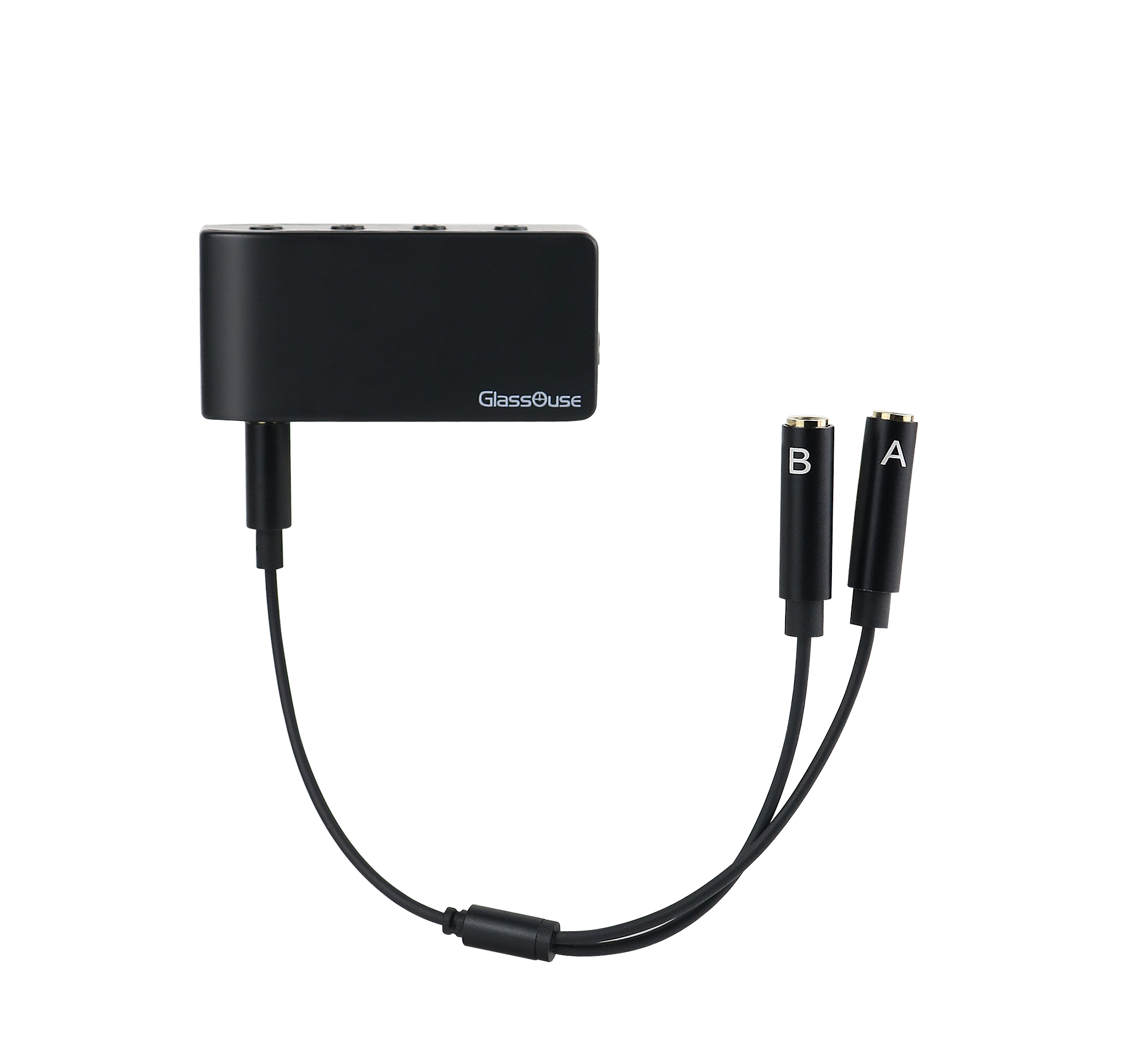 A 3.5 mm jack splitter, allowing the user to connect two assistive switches (3.5 mm jack) to a single port on GlassOuse PRO and GlassOuse Link. Both the connected switches functions can be assigned or changed using GlassOuse APP.
